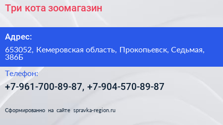 Три кота, зоомагазин по адресу 653052, Кемеровская область, Прокопьевск, Седьмая, 386Б в дальнейшем Организация, размещена в следующих категориях: