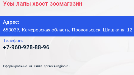 Усы лапы хвост, зоомагазин по адресу 653039, Кемеровская область, Прокопьевск, Шишкина, 12 в дальнейшем Организация, размещена в следующих категориях: