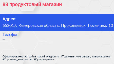 88, продуктовый магазин по адресу 653017, Кемеровская область, Прокопьевск, Тюленина, 13 в дальнейшем Организация, размещена в следующих категориях: