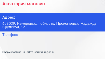 Акватория, магазин по адресу 653039, Кемеровская область, Прокопьевск, Надежды Крупской, 12 в дальнейшем Организация, размещена в следующих категориях:
