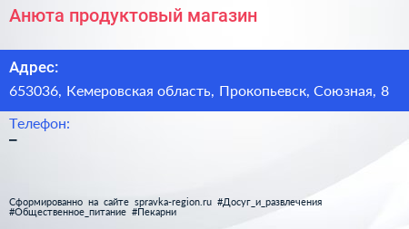 Анюта, продуктовый магазин по адресу 653036, Кемеровская область, Прокопьевск, Союзная, 8 в дальнейшем Организация, размещена в следующих категориях: