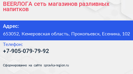 BEERЛОГА, сеть магазинов разливных напитков по адресу 653052, Кемеровская область, Прокопьевск, Есенина, 102 в дальнейшем Организация, размещена в следующих категориях: