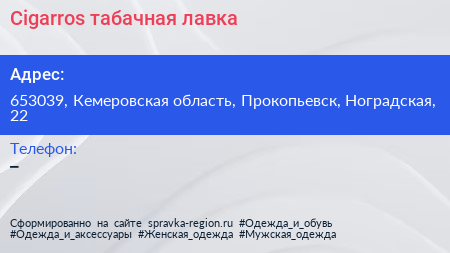 Cigarros, табачная лавка по адресу 653039, Кемеровская область, Прокопьевск, Ноградская, 22 в дальнейшем Организация, размещена в следующих категориях: