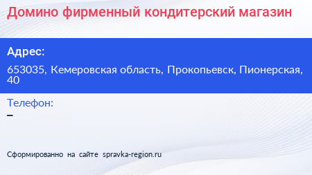 Домино, фирменный кондитерский магазин по адресу 653035, Кемеровская область, Прокопьевск, Пионерская, 40 в дальнейшем Организация, размещена в следующих категориях: