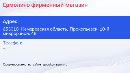Ермолино, фирменный магазин по адресу 653010, Кемеровская область, Прокопьевск, 10-й микрорайон, 48 в дальнейшем Организация, размещена в следующих категориях:
