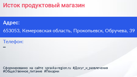 Исток, продуктовый магазин по адресу 653053, Кемеровская область, Прокопьевск, Обручева, 39 в дальнейшем Организация, размещена в следующих категориях: