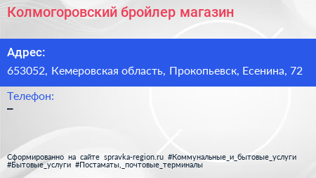 Колмогоровский бройлер, магазин по адресу 653052, Кемеровская область, Прокопьевск, Есенина, 72 в дальнейшем Организация, размещена в следующих категориях: