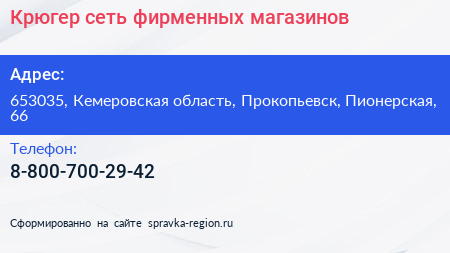 Крюгер, сеть фирменных магазинов по адресу 653035, Кемеровская область, Прокопьевск, Пионерская, 66 в дальнейшем Организация, размещена в следующих категориях: