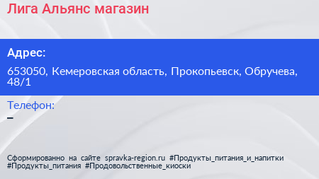 Лига-Альянс, магазин по адресу 653050, Кемеровская область, Прокопьевск, Обручева, 48/1 в дальнейшем Организация, размещена в следующих категориях: