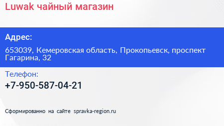 Luwak, чайный магазин по адресу 653039, Кемеровская область, Прокопьевск, проспект Гагарина, 32 в дальнейшем Организация, размещена в следующих категориях: