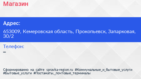 Магазин по адресу 653009, Кемеровская область, Прокопьевск, Запарковая, 30/2 в дальнейшем Организация, размещена в следующих категориях: