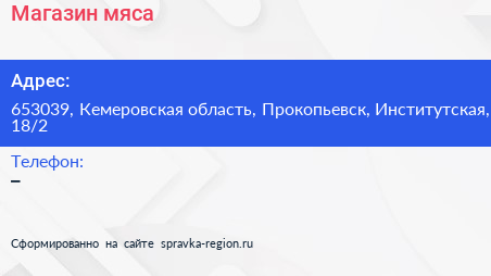 Магазин мяса по адресу 653039, Кемеровская область, Прокопьевск, Институтская, 18/2 в дальнейшем Организация, размещена в следующих категориях: