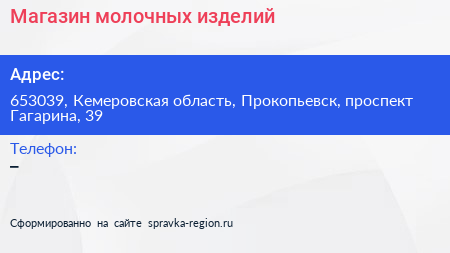 Магазин молочных изделий по адресу 653039, Кемеровская область, Прокопьевск, проспект Гагарина, 39 в дальнейшем Организация, размещена в следующих категориях: