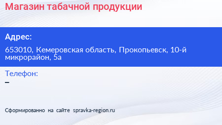 Магазин табачной продукции по адресу 653010, Кемеровская область, Прокопьевск, 10-й микрорайон, 5а в дальнейшем Организация, размещена в следующих категориях: