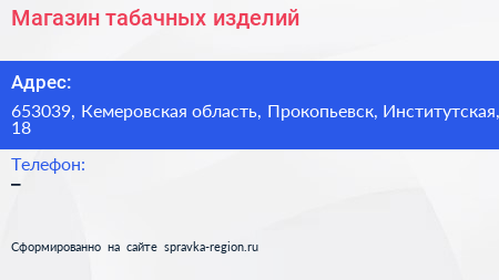 Магазин табачных изделий по адресу 653039, Кемеровская область, Прокопьевск, Институтская, 18 в дальнейшем Организация, размещена в следующих категориях: