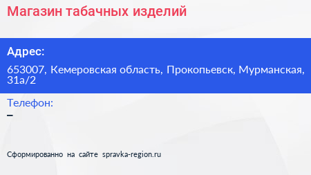 Магазин табачных изделий по адресу 653007, Кемеровская область, Прокопьевск, Мурманская, 31а/2 в дальнейшем Организация, размещена в следующих категориях: