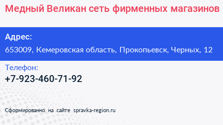 Медный Великан, сеть фирменных магазинов по адресу 653009, Кемеровская область, Прокопьевск, Черных, 12 в дальнейшем Организация, размещена в следующих категориях: