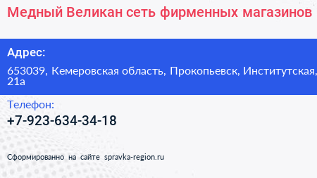 Медный Великан, сеть фирменных магазинов по адресу 653039, Кемеровская область, Прокопьевск, Институтская, 21а в дальнейшем Организация, размещена в следующих категориях: