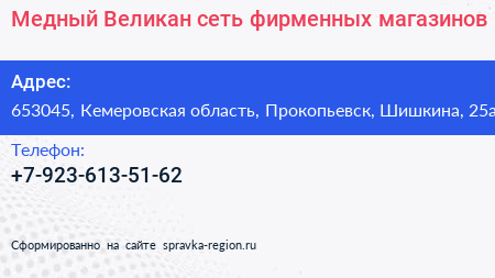 Медный Великан, сеть фирменных магазинов по адресу 653045, Кемеровская область, Прокопьевск, Шишкина, 25а в дальнейшем Организация, размещена в следующих категориях: