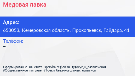Медовая лавка по адресу 653053, Кемеровская область, Прокопьевск, Гайдара, 41 в дальнейшем Организация, размещена в следующих категориях:
