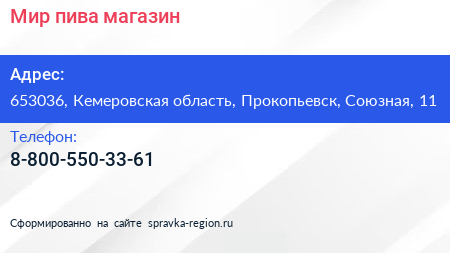 Мир пива, магазин по адресу 653036, Кемеровская область, Прокопьевск, Союзная, 11 в дальнейшем Организация, размещена в следующих категориях: