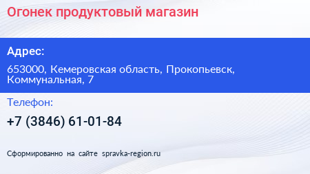 Огонек, продуктовый магазин по адресу 653000, Кемеровская область, Прокопьевск, Коммунальная, 7 в дальнейшем Организация, размещена в следующих категориях: