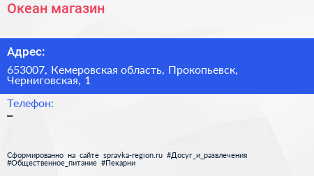 Океан, магазин по адресу 653007, Кемеровская область, Прокопьевск, Черниговская, 1 в дальнейшем Организация, размещена в следующих категориях: