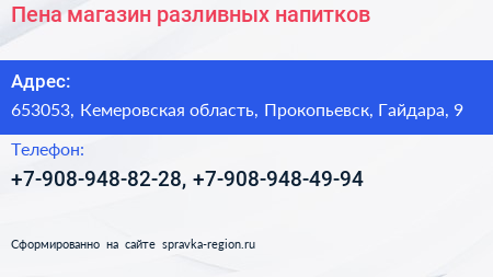 Пена, магазин разливных напитков по адресу 653053, Кемеровская область, Прокопьевск, Гайдара, 9 в дальнейшем Организация, размещена в следующих категориях: