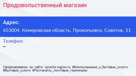 Продовольственный магазин по адресу 653004, Кемеровская область, Прокопьевск, Советов, 11 в дальнейшем Организация, размещена в следующих категориях: