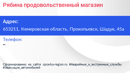 Рябина, продовольственный магазин по адресу 653211, Кемеровская область, Прокопьевск, Шадук, 45а в дальнейшем Организация, размещена в следующих категориях:
