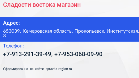 Сладости востока, магазин по адресу 653039, Кемеровская область, Прокопьевск, Институтская, 3 в дальнейшем Организация, размещена в следующих категориях: