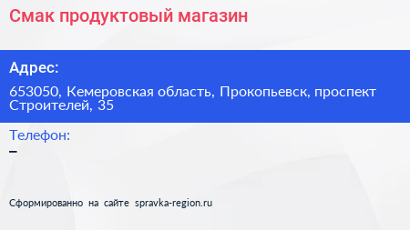 Смак, продуктовый магазин по адресу 653050, Кемеровская область, Прокопьевск, проспект Строителей, 35 в дальнейшем Организация, размещена в следующих категориях: