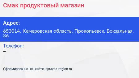 Смак, продуктовый магазин по адресу 653014, Кемеровская область, Прокопьевск, Вокзальная, 36 в дальнейшем Организация, размещена в следующих категориях: