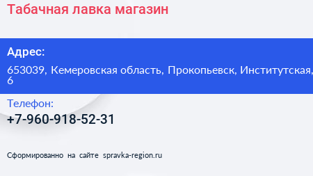 Табачная лавка, магазин по адресу 653039, Кемеровская область, Прокопьевск, Институтская, 6 в дальнейшем Организация, размещена в следующих категориях: