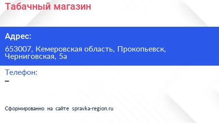 Табачный магазин по адресу 653007, Кемеровская область, Прокопьевск, Черниговская, 5а в дальнейшем Организация, размещена в следующих категориях: