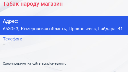 Табак народу, магазин по адресу 653053, Кемеровская область, Прокопьевск, Гайдара, 41 в дальнейшем Организация, размещена в следующих категориях: