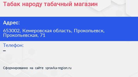 Табак народу, табачный магазин по адресу 653002, Кемеровская область, Прокопьевск, Прокопьевская, 71 в дальнейшем Организация, размещена в следующих категориях: