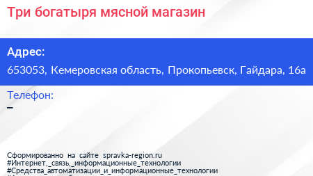 Три богатыря, мясной магазин по адресу 653053, Кемеровская область, Прокопьевск, Гайдара, 16а в дальнейшем Организация, размещена в следующих категориях: