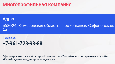 Многопрофильная компания по адресу 653024, Кемеровская область, Прокопьевск, Сафоновская, 1а в дальнейшем Организация, размещена в следующих категориях: