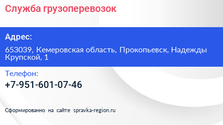 Служба грузоперевозок по адресу 653039, Кемеровская область, Прокопьевск, Надежды Крупской, 1 в дальнейшем Организация, размещена в следующих категориях: