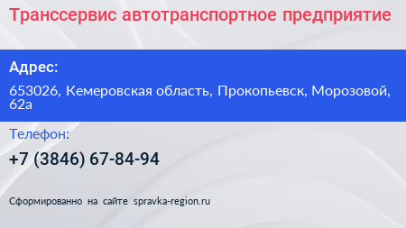 Транссервис, автотранспортное предприятие по адресу 653026, Кемеровская область, Прокопьевск, Морозовой, 62а в дальнейшем Организация, размещена в следующих категориях: