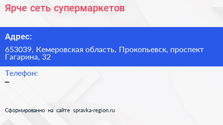 Ярче!, сеть супермаркетов по адресу 653039, Кемеровская область, Прокопьевск, проспект Гагарина, 32 в дальнейшем Организация, размещена в следующих категориях: