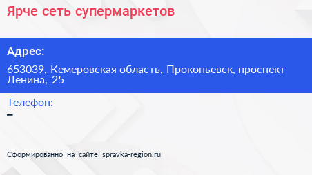 Ярче!, сеть супермаркетов по адресу 653039, Кемеровская область, Прокопьевск, проспект Ленина, 25 в дальнейшем Организация, размещена в следующих категориях: