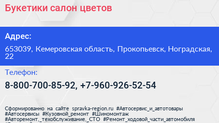 Букетики, салон цветов по адресу 653039, Кемеровская область, Прокопьевск, Ноградская, 22 в дальнейшем Организация, размещена в следующих категориях: