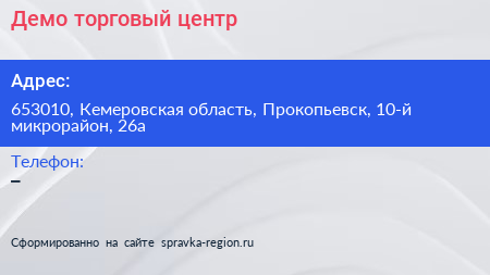 Демо, торговый центр по адресу 653010, Кемеровская область, Прокопьевск, 10-й микрорайон, 26а в дальнейшем Организация, размещена в следующих категориях: