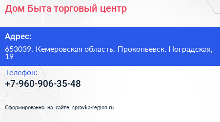 Дом Быта, торговый центр по адресу 653039, Кемеровская область, Прокопьевск, Ноградская, 19 в дальнейшем Организация, размещена в следующих категориях: