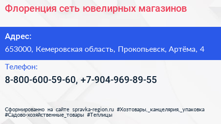 Флоренция, сеть ювелирных магазинов по адресу 653000, Кемеровская область, Прокопьевск, Артёма, 4 в дальнейшем Организация, размещена в следующих категориях:
