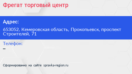Фрегат, торговый центр по адресу 653052, Кемеровская область, Прокопьевск, проспект Строителей, 71 в дальнейшем Организация, размещена в следующих категориях: