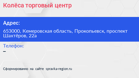 Колёса, торговый центр по адресу 653000, Кемеровская область, Прокопьевск, проспект Шахтёров, 22а в дальнейшем Организация, размещена в следующих категориях: