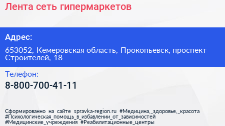 Лента, сеть гипермаркетов по адресу 653052, Кемеровская область, Прокопьевск, проспект Строителей, 18 в дальнейшем Организация, размещена в следующих категориях: